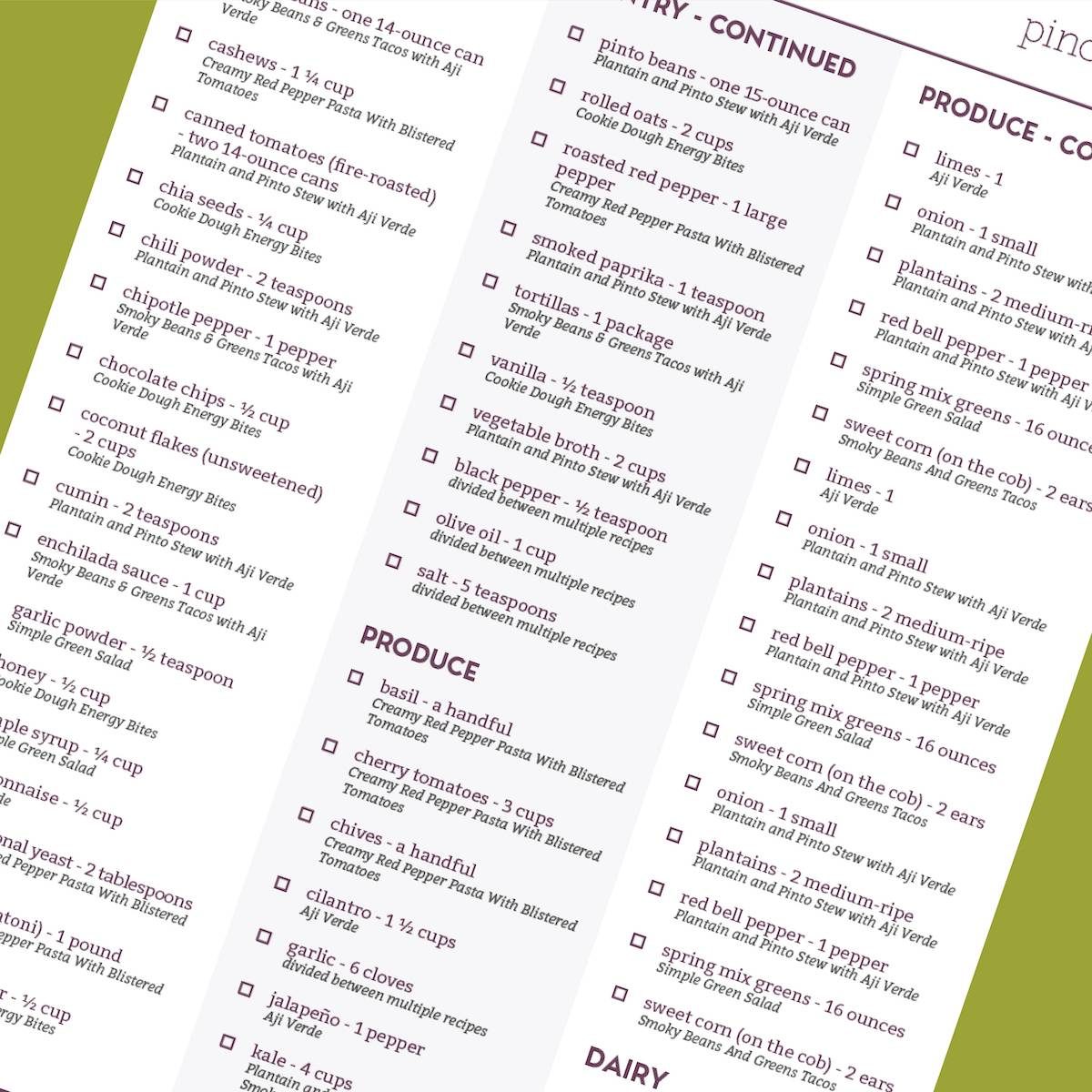 TWO thorough pick-and-choose grocery lists to get you everything you’ll need for the week, sorted either by category or recipe (if you’re not making all five), all check-able to account for everything you need, and nothing you don’t.